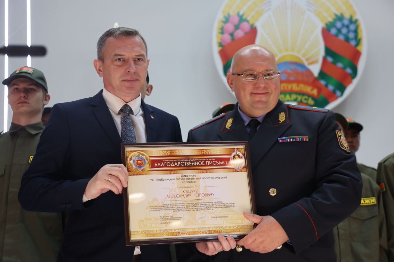 19 октября состоялось торжественное открытие военно-патриотического клуба "Стражи" в УО "Кобринский государственный политехнический колледж". В мероприятии приняли участие председатель Кобринского районного Совета депутатов Иван Довжук, начальник УВД Брестского облисполкома генерал-майор милиции Олег Шуляковский, начальник главного управления образования Брестского облисполкома Наталья Калиновская, представители силовых структур, духовенства Кобринщины.