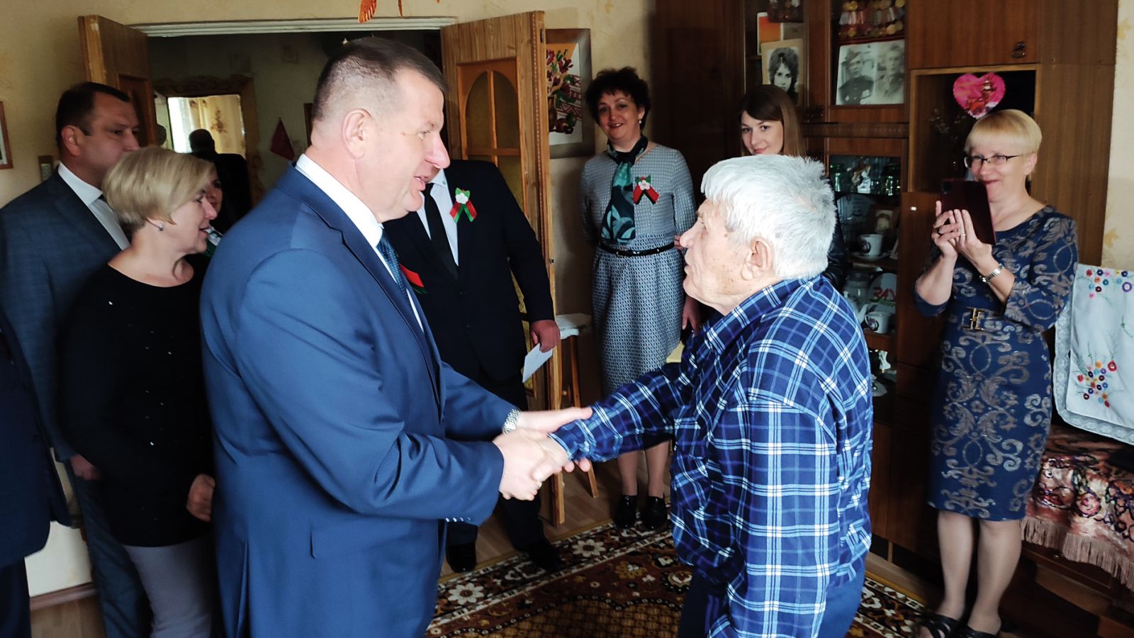В торжественной обстановке праздничная делегация во главе с председателем райисполкома Александром Пачко 4 мая посетила ветерана Великой Отечественной, кавалера ордена Великой Отечественной войны и Красной Звезды, обладателя трёх медалей «За Отвагу» и многих других наград Нинеля Гасюка.