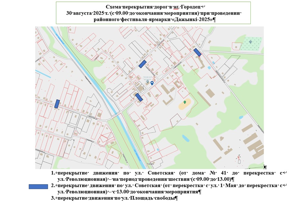 Схема перекрытия дорог в аг. Городец 30 августа 2025 г. (с 09.00 до окончания мероприятия) при проведении районного фестиваля-ярмарки «Дажынкі-2025»